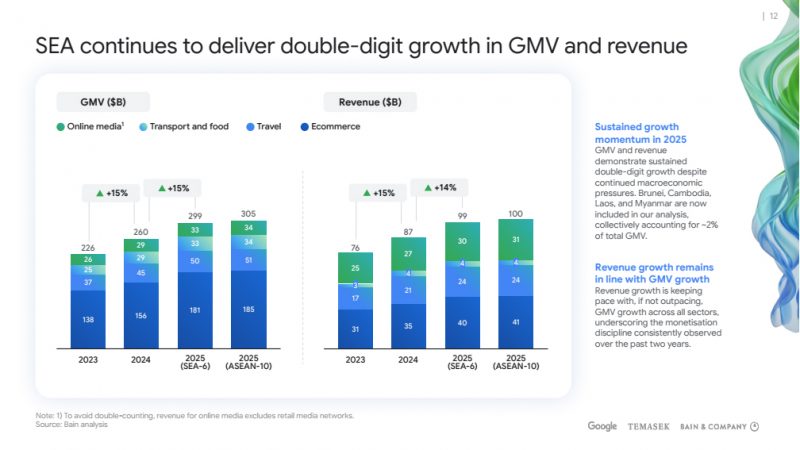 Theo báo cáo SEA e-Conomy 2025 thì khu vực tiếp tục duy trì đà tăng trưởng mạnh mẽ, dự kiến vượt mốc 300 tỷ USD tổng giá trị hàng hóa (GMV) vào năm 2025. Mức tăng trưởng GMV và doanh thu duy trì ở mức ổn định khoảng 15% so với cùng kỳ năm trước (YoY), nhờ sự tham gia sâu rộng của người tiêu dùng kỹ thuật số và các chiến lược kiếm tiền hiệu quả hơn từ các nền tảng.