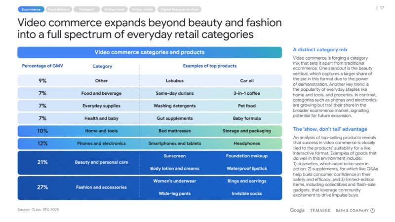 – Video Commerce (tạm dịch: Thương mại video) bùng nổ: Thương mại video hiện chiếm khoảng 25% tổng GMV của thương mại điện tử, tăng mạnh từ mức dưới 5% vào năm 2022. GMV của mảng này đã tăng 2,5 lần chỉ trong hai năm.