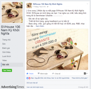 Ví dụ: Vào ngày 07/07/2016 vừa qua trên trang của SVHouse NKKN (một shop bán tai nghe Senheiser) có làm chương trình [Give Away] tặng tai nghe Senheiser Urbanite với nội dung “Nhân dịp ra mắt page SVHouse 106 Nam Kỳ Khởi Nghĩa HCM. SVHouse xin kính tặng các bạn tai nghe cực chất, kiểu dáng thời trang là Senheiser Urbanite”, và trong vòng 30-45 phút đã đạt gần 450 lượt phản hồi, hơn 350 lượt thích và hơn 350 lượt chia sẻ.