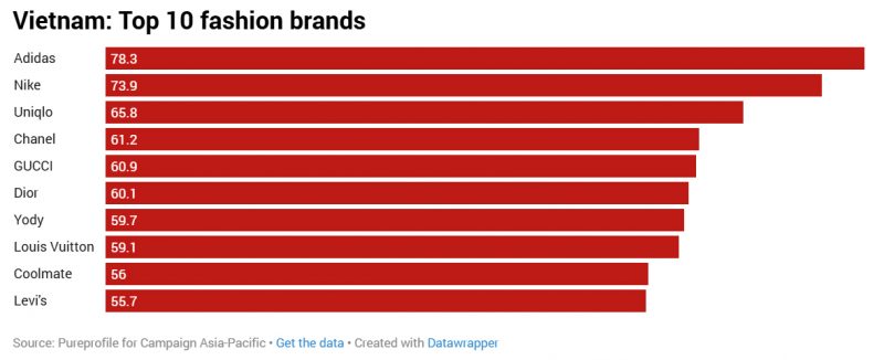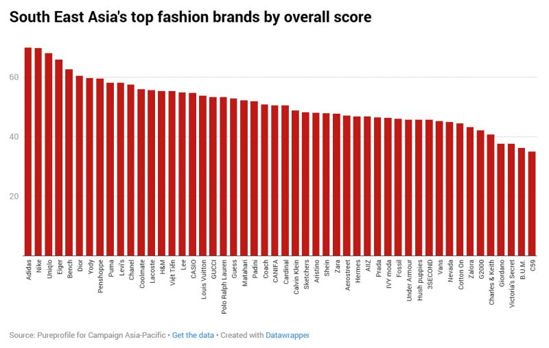Theo khảo sát của Campaign Asia và Pureprofile thì hãng đồ thể thao khổng lồ của Đức – Adidas – giành được vị trí dẫn đầu trong danh sách các thương hiệu thời trang hàng đầu Đông Nam Á năm 2025, đồng thời lân đầu tiên có 3 thương hiệu Việt Nam lọt vào Top 15 thương hiệu thời trang tại khu vực Đông Nam Á lần lượt theo thứ tự là: Yody (Top7), CoolMate (Top12) & Việt Tiến (Top15) – và nếu để ý xa xa trong bảng dữ liệu bên dưới chúng ta thấy trong TOP50 còn có các thương hiệu Việt Nam như CANIFA, Aristino, IVY Moda.