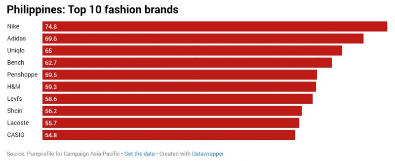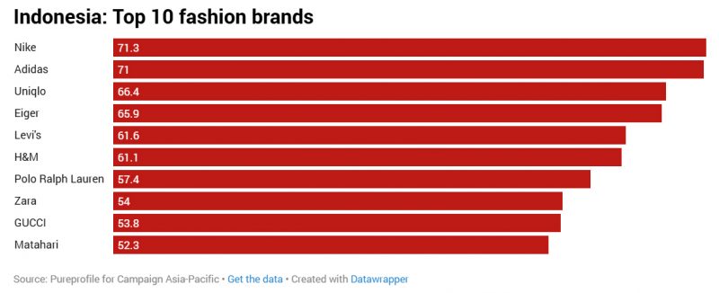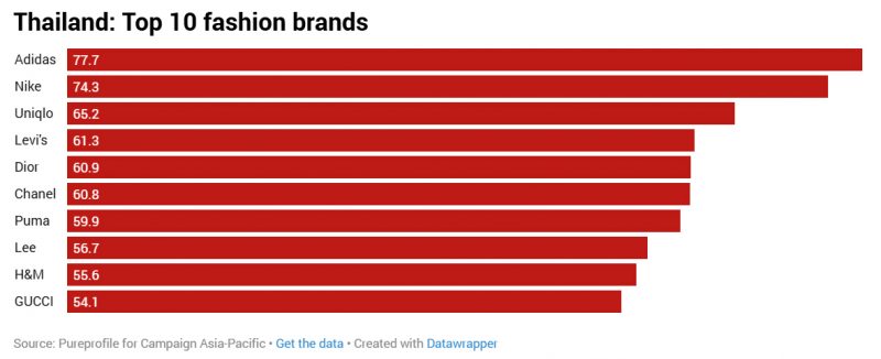 Khảo sát về thị trường Đông Nam Á được công bố trong bối cảnh Adidas đang chứng kiến sự tăng trưởng vượt bậc về mức độ phổ biến, với thị phần toàn cầu tăng từ 8,2% lên 8,9% vào năm ngoái. Chìa khóa thành công này chính là sự hồi sinh của các dòng sản phẩm biểu tượng như Samba, Gazelle và Handball Spezial, cùng với những đôi giày chạy bộ cổ điển như SL72, cùng với sự hợp tác với các vận động viên như Lionel Messi và các thương hiệu thời thượng khác, góp phần nâng cao độ nhận biết và sức hút thời trang của thương hiệu. Thương hiệu đồ thể thao lớn này đạt tổng điểm thương hiệu tốt nhất là 69,9. Đây là một bước nhảy vọt so với điểm số năm ngoái (56,9) khi Adidas đứng thứ năm sau Nike và Uniqlo.